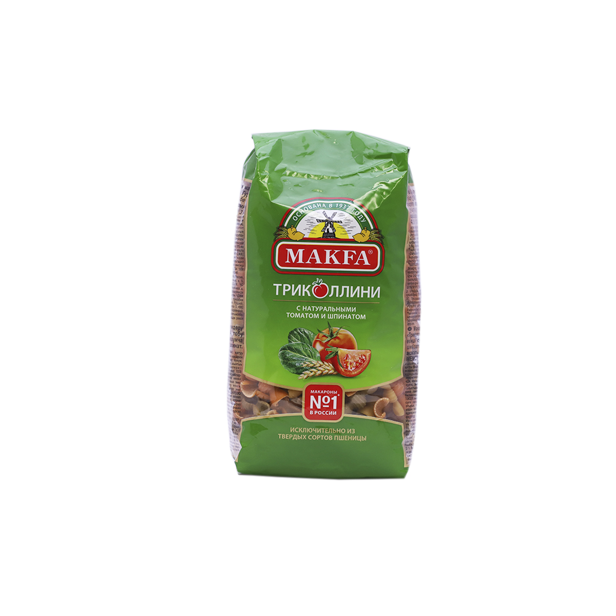 Макаронные изделия с натуральными томатом и шпинатом в составе. Супервитаминный микс полезных свойств твердой пшеницы, натуральных томата и шпината. Сочетание великолепных диетических свойств твердой пшеницы, натурального шпината и томата позволяют отнести этот продукт к самым полезным среди других макаронных изделий.Варятся 12 минут.