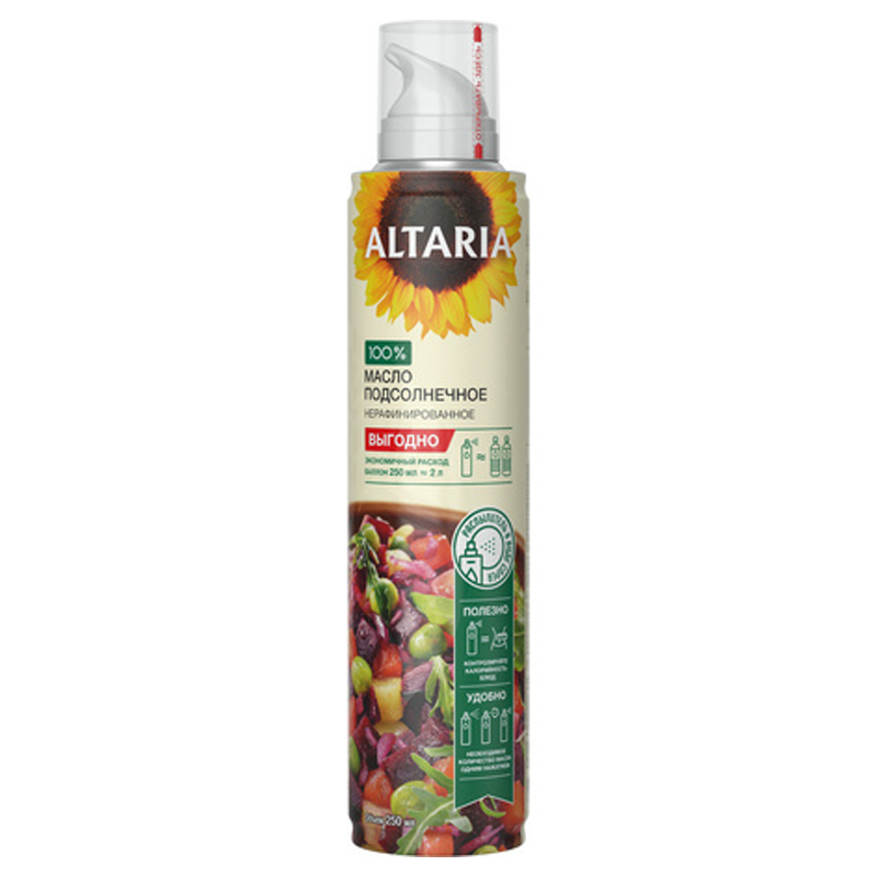 ALTARIA Подсолнечное масло — натуральное нерафинированное масло холодного отжима в удобном формате-спрей. Сохраняет природные витамины, антиоксиданты и ценные жирные кислоты. Обладает лёгким вкусом и универсально в применении для ежедневного приготовления пищи.