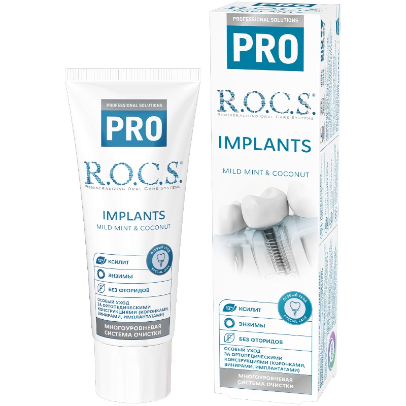 Зубная паста R.O.C.S.® PRO Implants уменьшает риск возникновения заболеваний в полости рта, которые могут быть связаны с наличием ортопедических конструкций (имплантаты, коронки, виниры). Позволяет пролонгировать период качественной эксплуатации и сохранить их внешний вид.