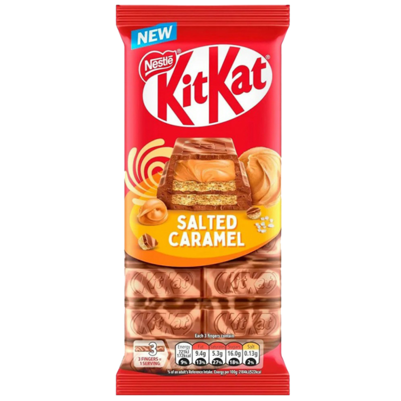 KitKat Шоколад с солёной карамелью (99 г) — это изысканный десерт, в котором классический хруст вафель сочетается с насыщенным шоколадом и ароматной карамелью.