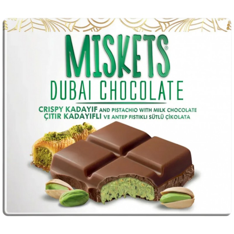 Шоколадная плитка Miskets Dubai Chocolate — это нежный молочный шоколад с богатой фисташковой начинкой, вдохновлённый восточными десертами. Мягкая сливочная сладость молочного шоколада идеально сочетается с кремовой, насыщенной фисташковой начинкой, создавая гармоничный вкус и приятное послевкусие. Отлично подходит для десерта, подарка и наслаждения с чаем или кофе.