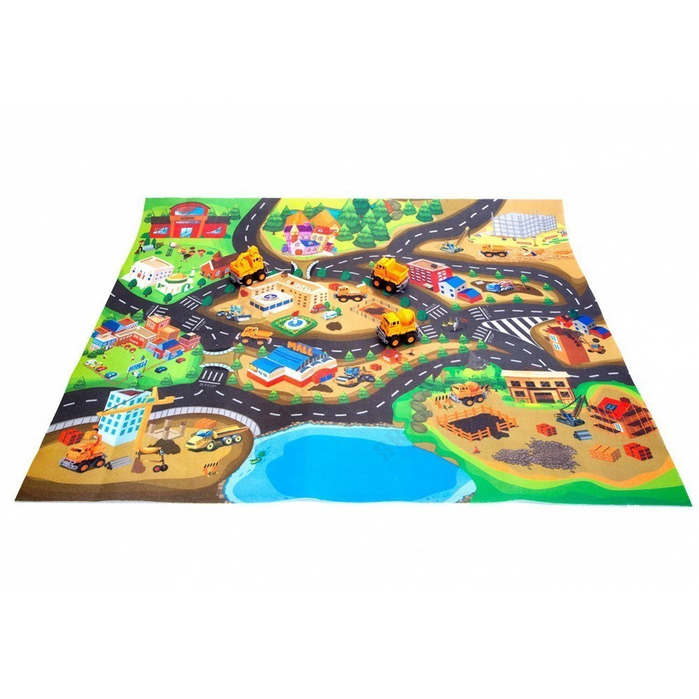 Развернутый коврик представляет собой целый игровой город с дорогами, магазинами, озером, парком и строительными площадками. Само полотно выполнено из плотного войлока