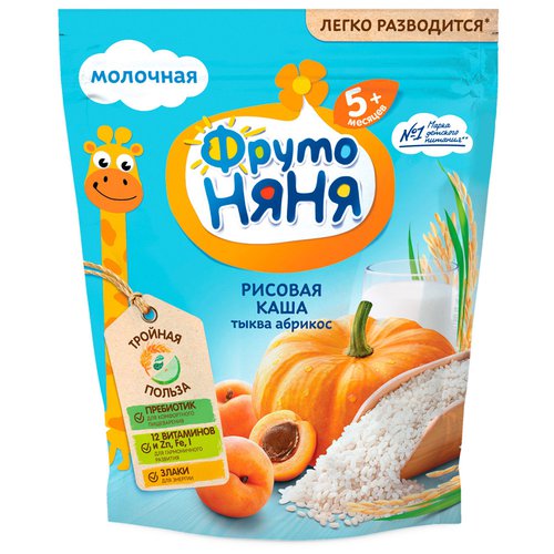 Каша молочная ФрутоНяня рисовая с тыквой и абрикосом с 5 месяцев, 200г. Без консервантов. Источник витаминов. Разводится без комочков. Без искусственных добавок, красителей. Без ГМО!