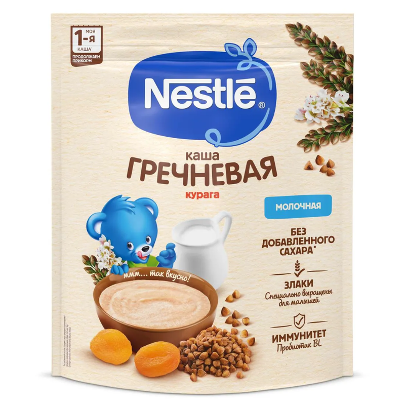 Nestlé гречневая каша с курагой — полезное питание для малышей после 5 месяцев, которое помогает расти здоровыми и активными.