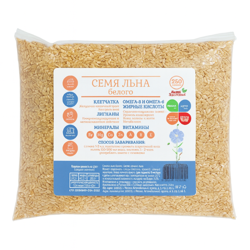 Белые семена льна «Ваше Здоровье» 250 г — полезное дополнение к рациону для тех, кто заботится о здоровье и правильном питании.